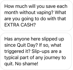Meet everyone in your group, get to know their stories and your guide. Then, reflect on the role vaping (and quitting) plays in your life, which helps keep you motivated to quit.